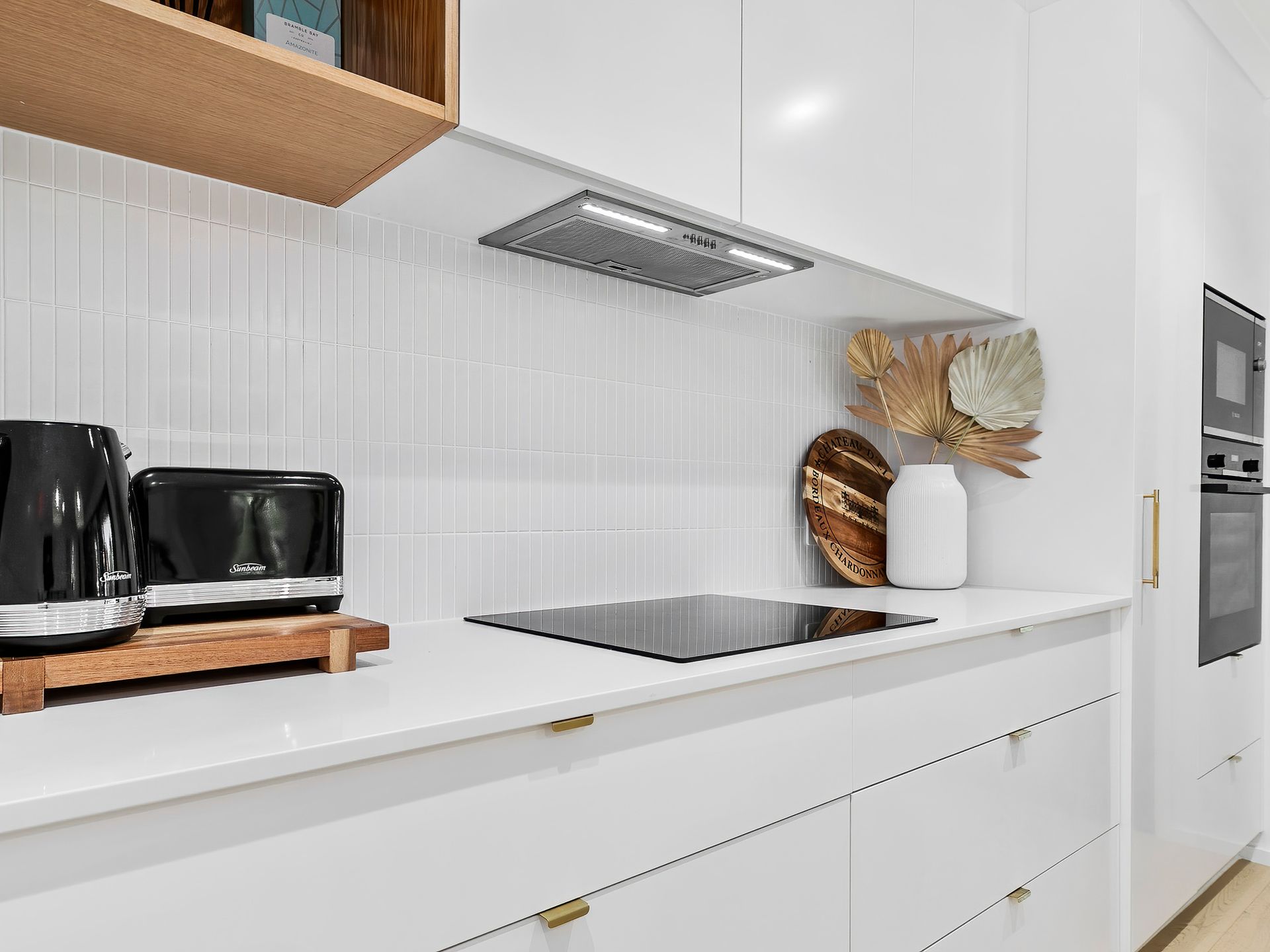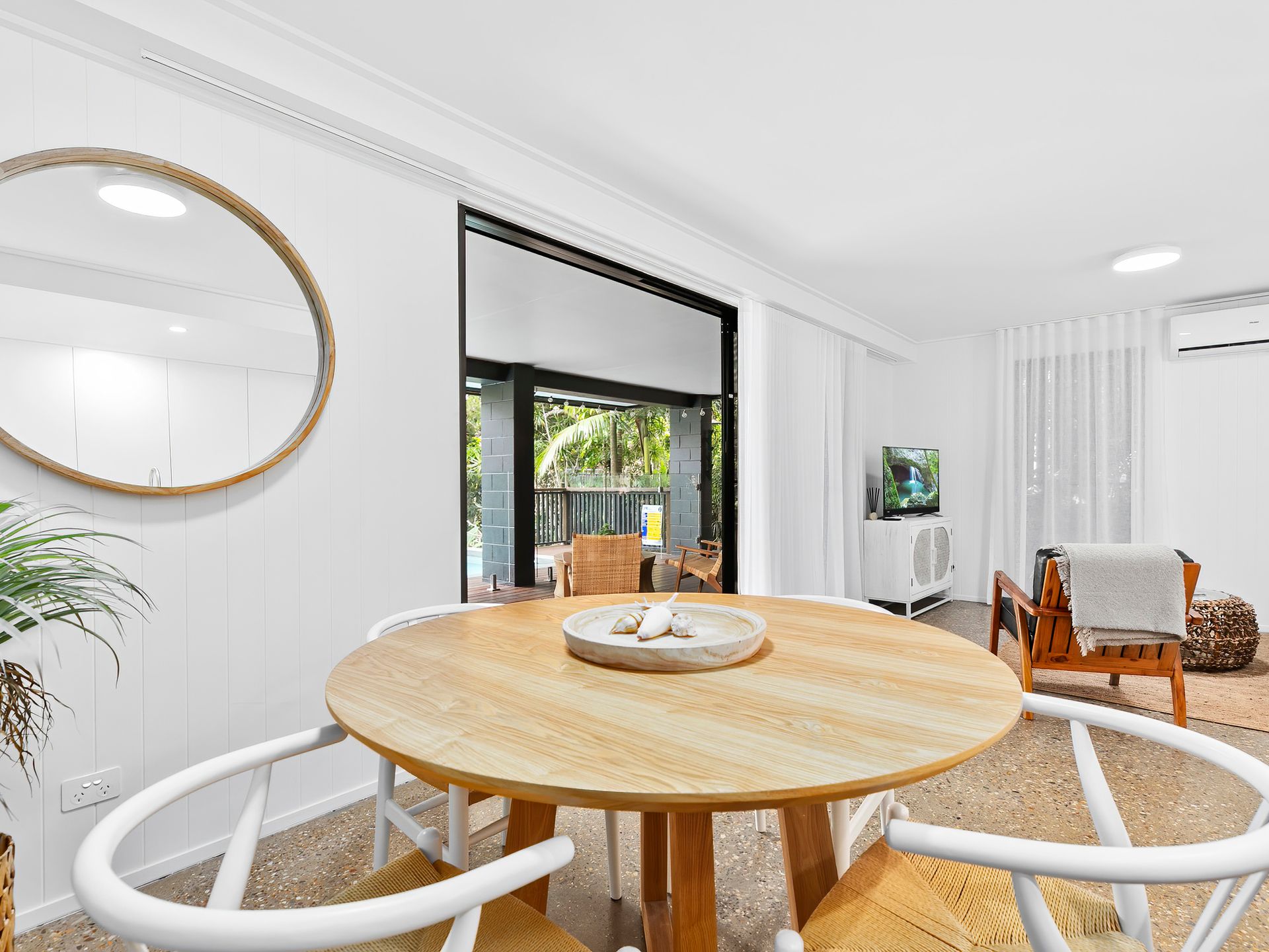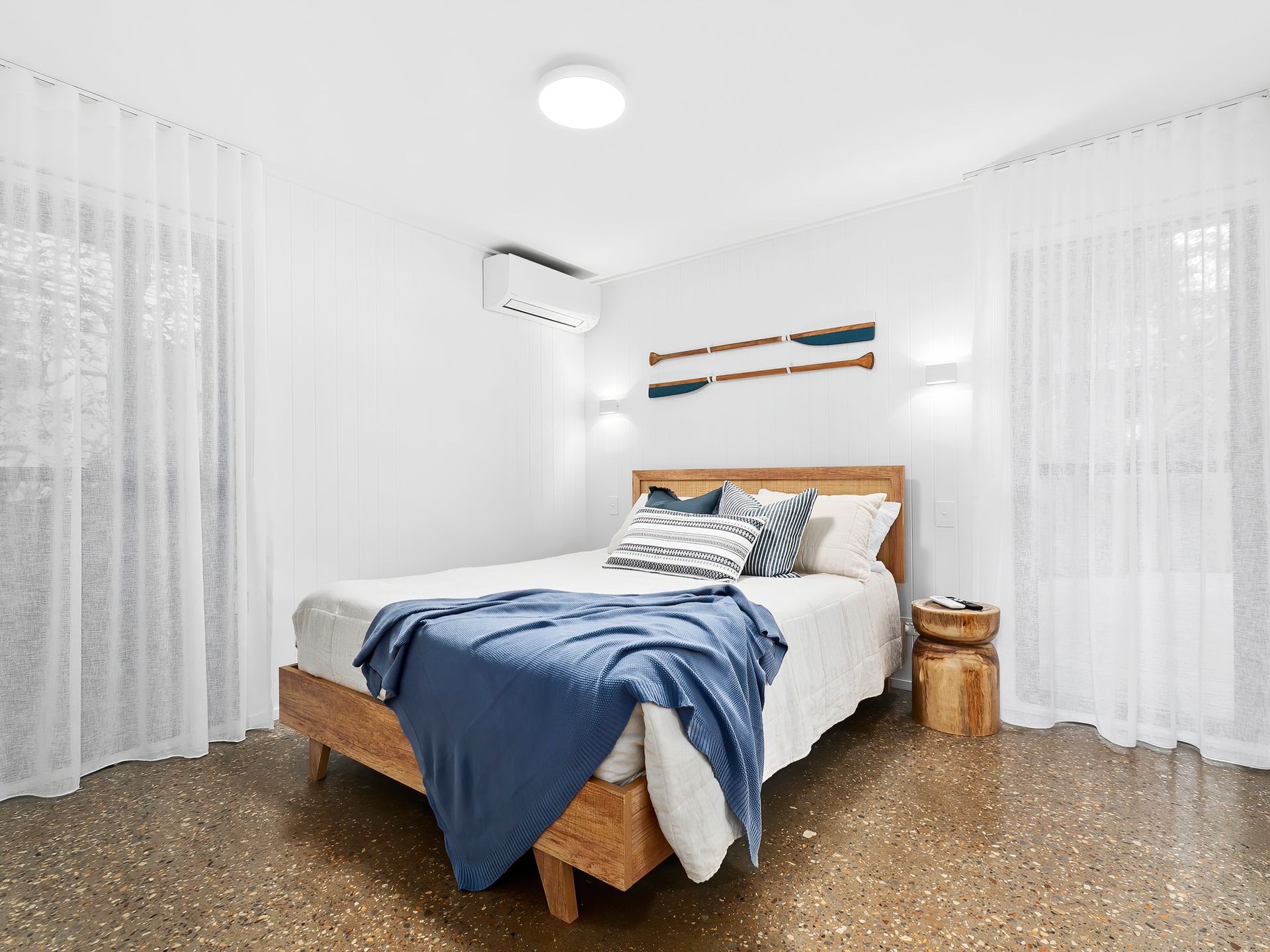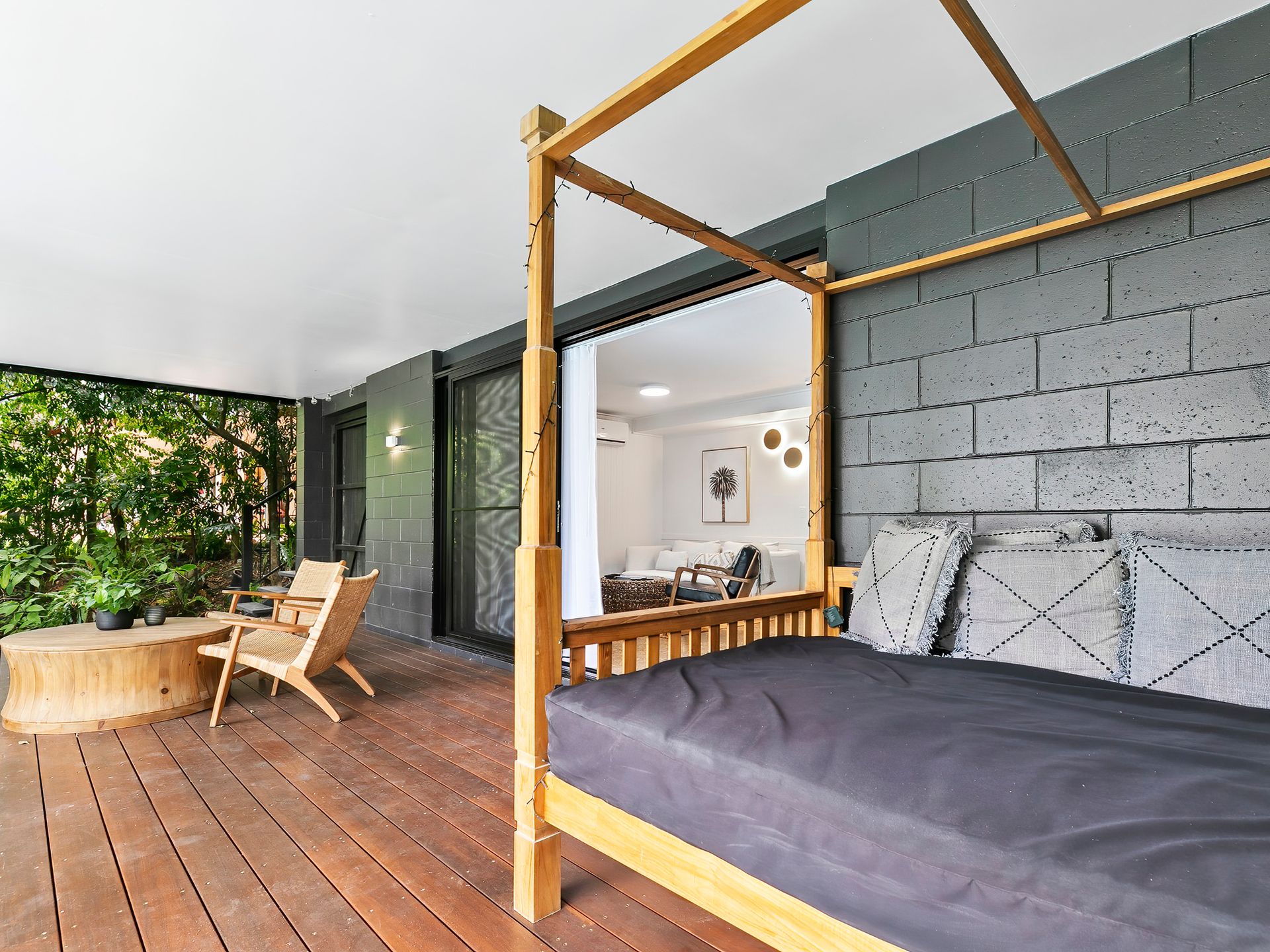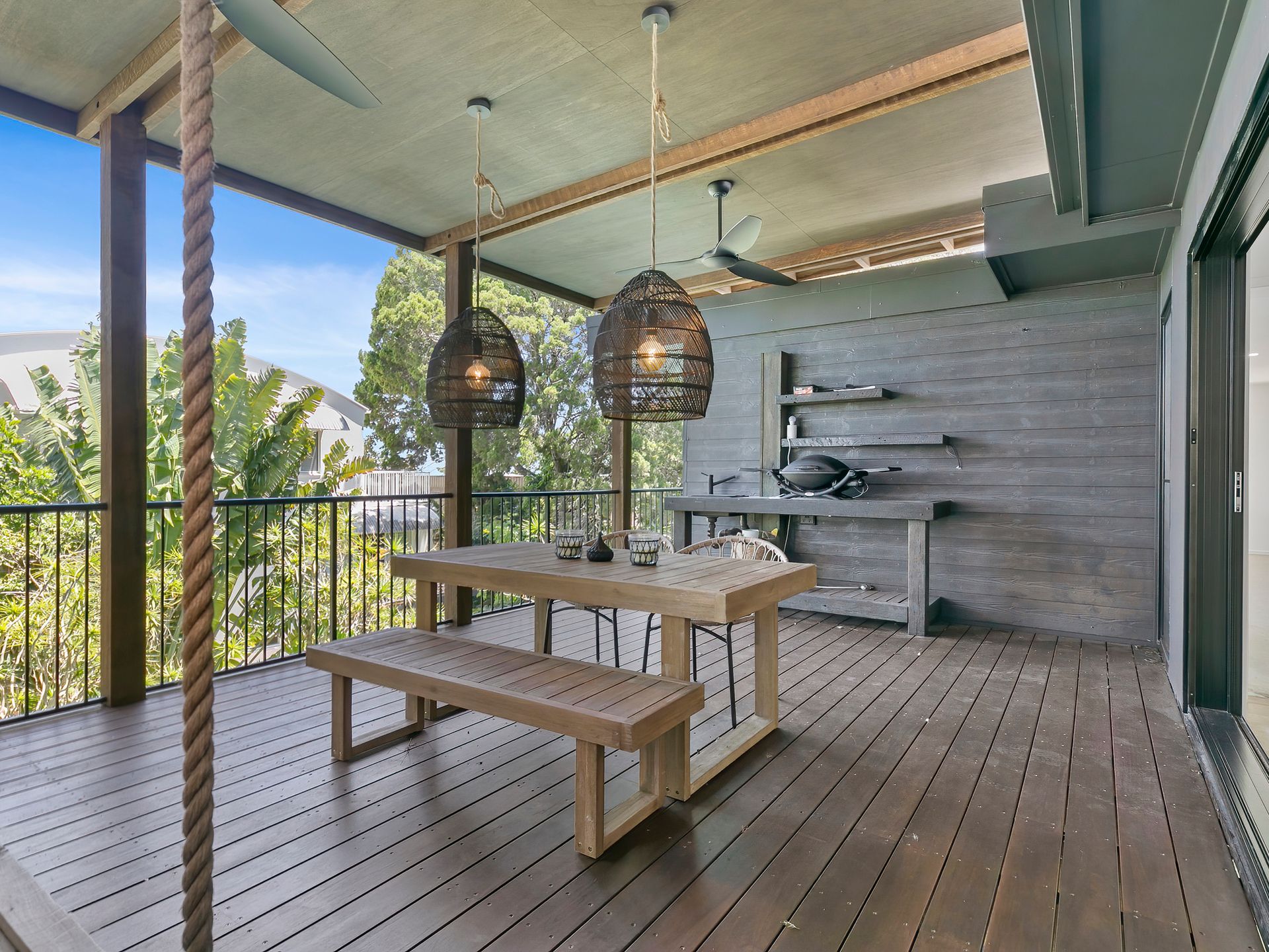 Ascending to the upper level, be captivated by the light-filled, open-plan kitchen boasting sleek design, integrated appliances, and elegant finishes. An adjoining spectacular deck offers pool views and a hanging day bed to soak in the surroundings. This level also includes a serene lounge area, a beautifully designed Scandinavian bathroom, a laundry, and three bedrooms – two with Queen beds and another with a bunk bed plus trundle.