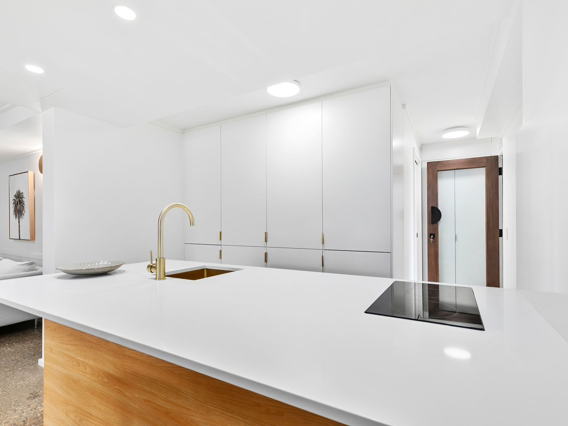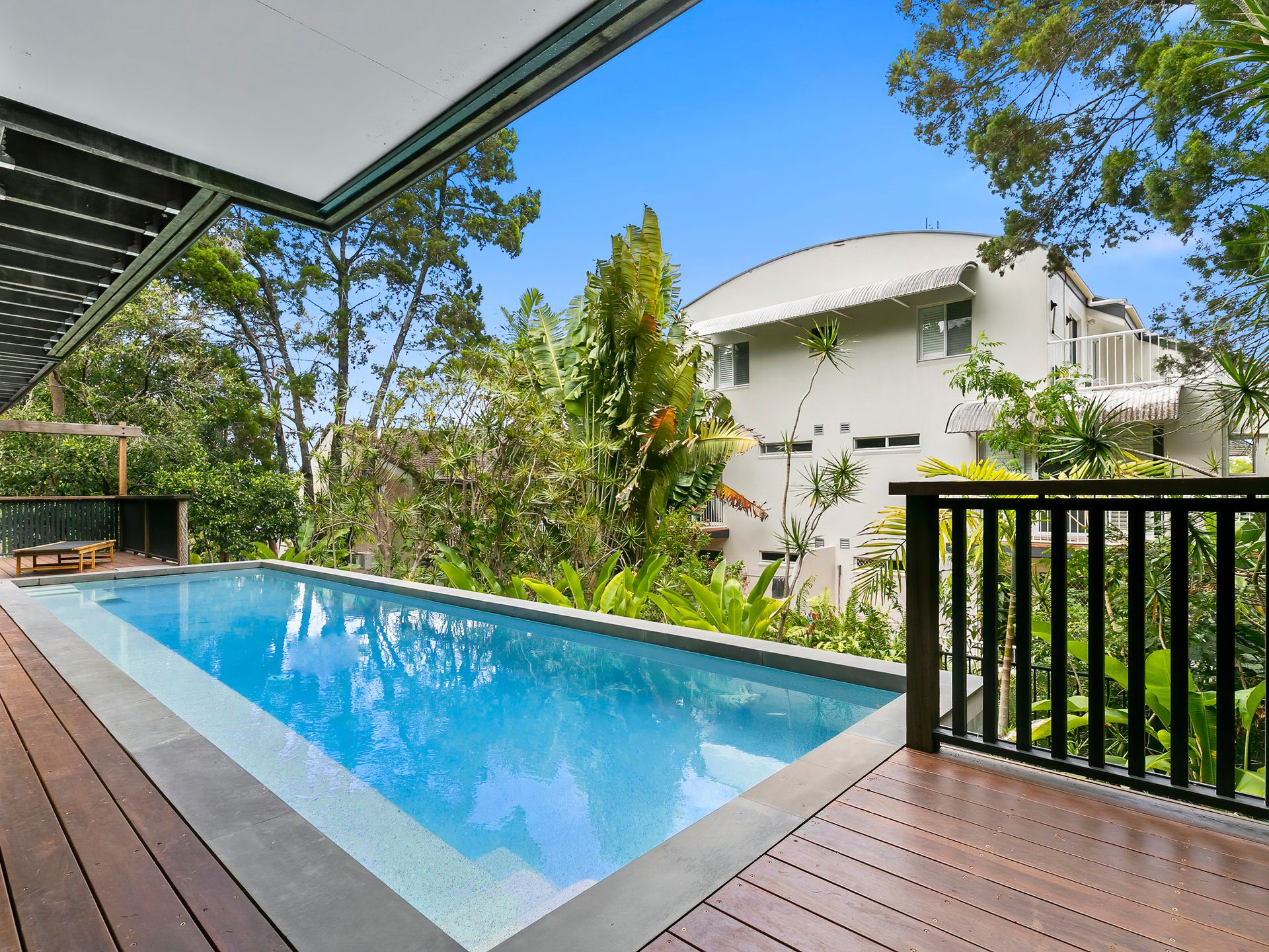 On the ground level, discover a separate, fully self-contained bedroom complete with a kitchen, bathroom, and lounge area. Sliding doors open to a deck overlooking the tranquil pool, featuring a day bed and sitting area for relaxation.