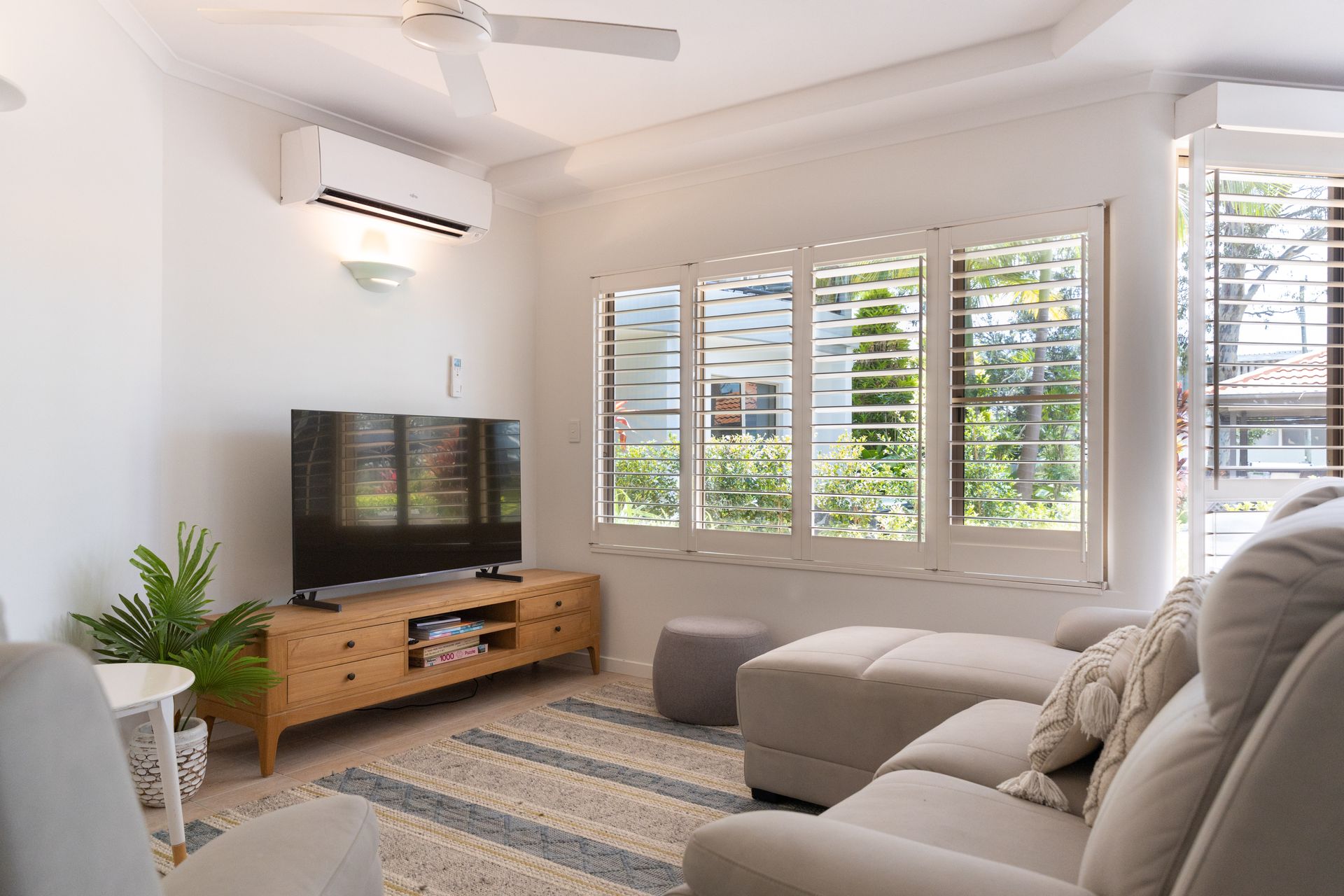 Inside, comfort meets style. The master bedroom offers a peaceful escape with a queen bed and private ensuite, while the second and third bedrooms (both air-conditioned) share a modern family bathroom – ideal for families or couples travelling together. Full air-conditioning, ceiling fans and WiFi ensure year-round comfort.