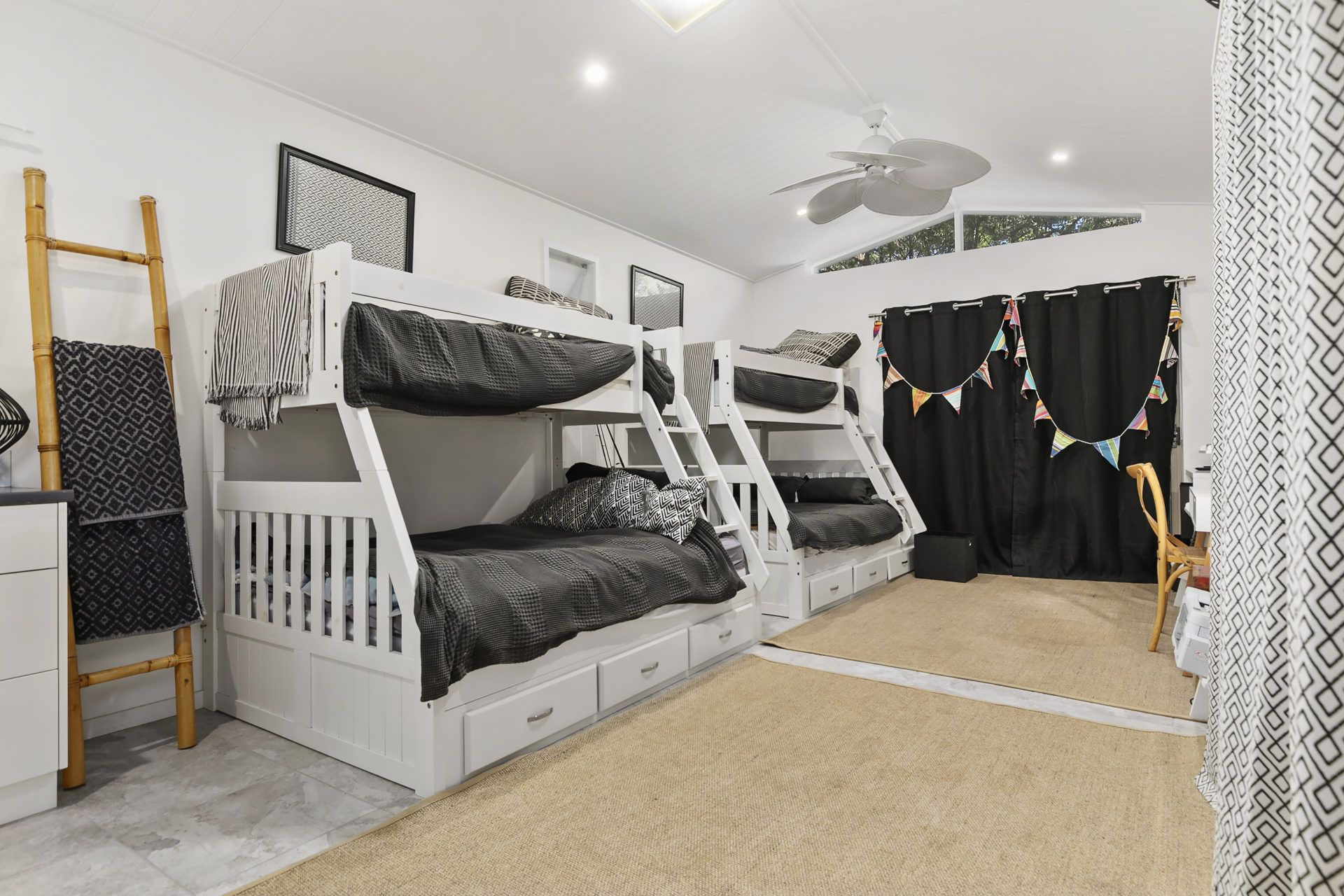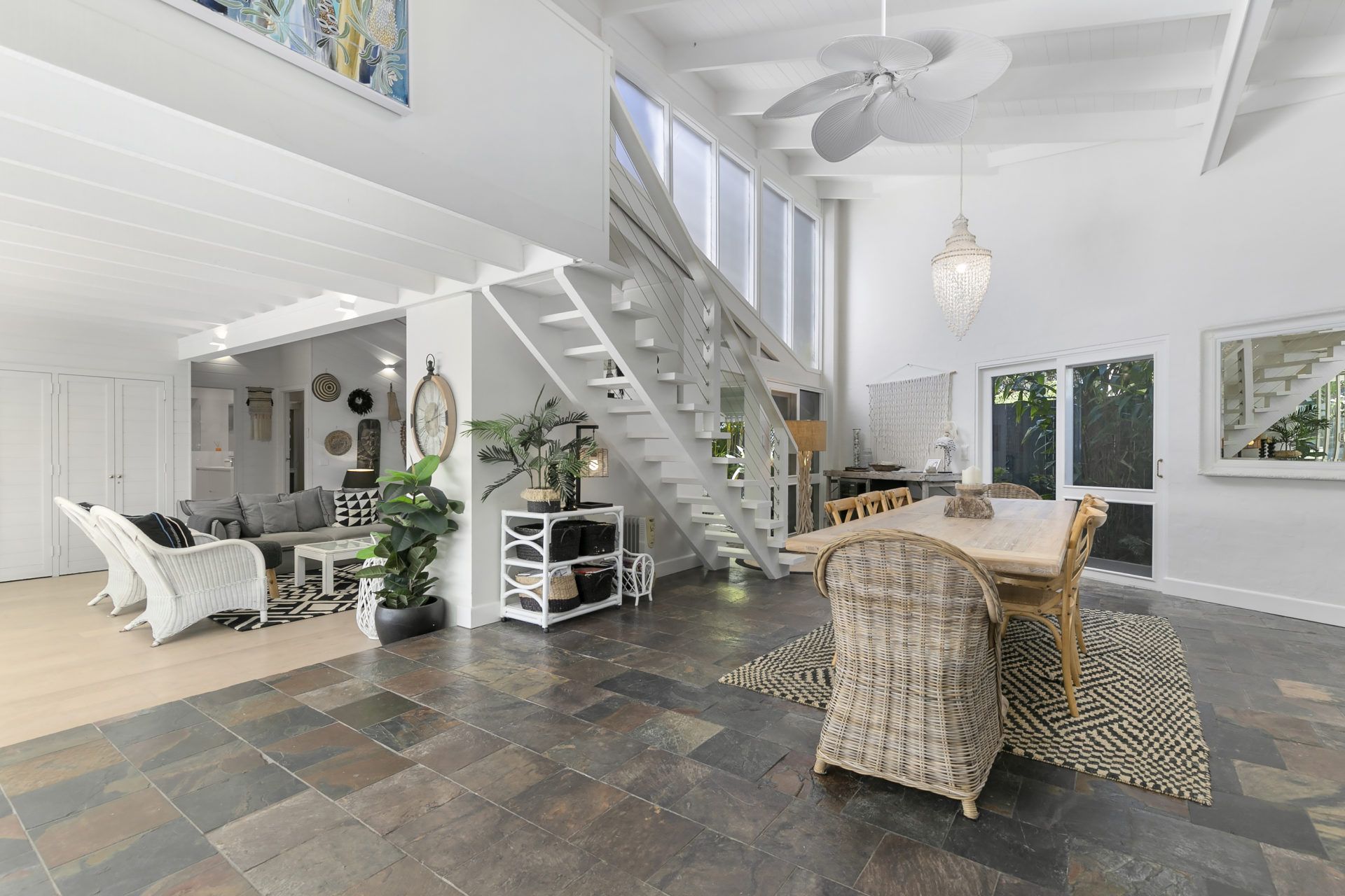 This fabulous open plan holiday home has great character and style . The home is unique in design and has a beautiful feel when you walk in the front door. Tucked away from the street ensuring exceptional privacy yet when you are inside the home it is open, light and relaxing, you could be anywhere. Recently renovated and meticulously maintained, with white cedar high raked ceilings and highlight windows illuminating your entire surrounds. All bedrooms are freshly presented in white, and elegantly styled. An additional advantage is the separate fourth bedroom which is a beach style studio/guest house with its own ensuite, kitchenette and private courtyard. With the open plan living area revealing natural stone flooring, the sunken lounge opens on both sides with full length glass doors to either an extensive covered alfresco space overlooking the exquisite pool with an amazing slate wall water feature and landscaped gardens or a relaxing tropical garden peace of paradise that backs onto Noosa National Park. The location is on Noosa Hill with a back gate access to the Noosa National Park. You can walk to Hastings street in ten minutes or walk to Sunshine Beach in half an hour, Everything is at your door step. The main house sleeps 6 guests; there are 3 bedrooms, two queen rooms and master with ensuite plus a room with twin beds.