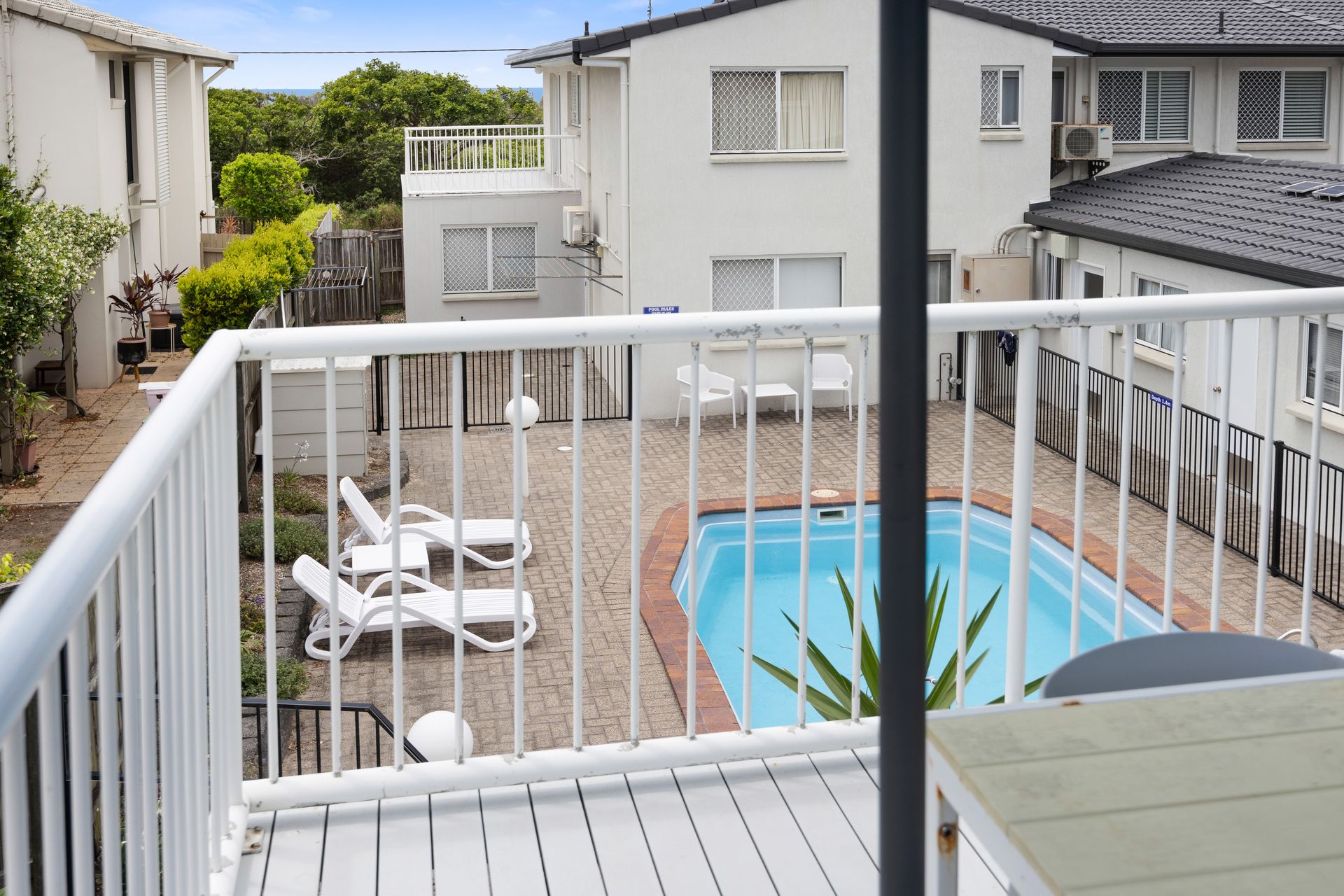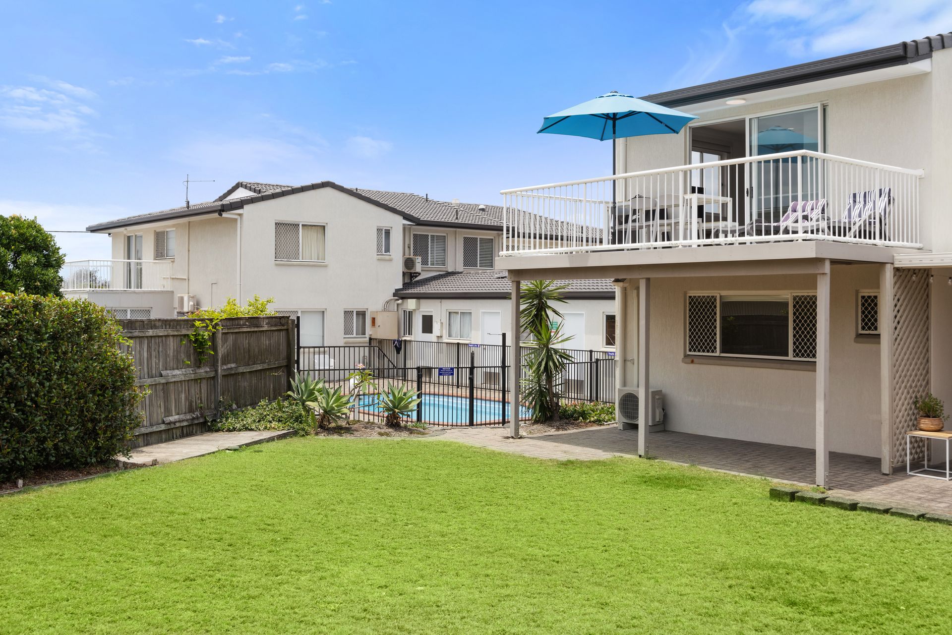 The sun drenched pool and shared green grass spaces, offer a great alternative to the beach.