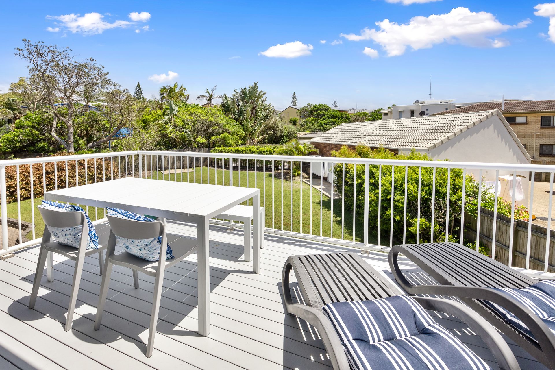 The upper balcony is a beautiful spot to sit in the morning, of an evening or any time of day! Fit with sun lounges, outdoor dining setting and a Webber Gas BBQ.