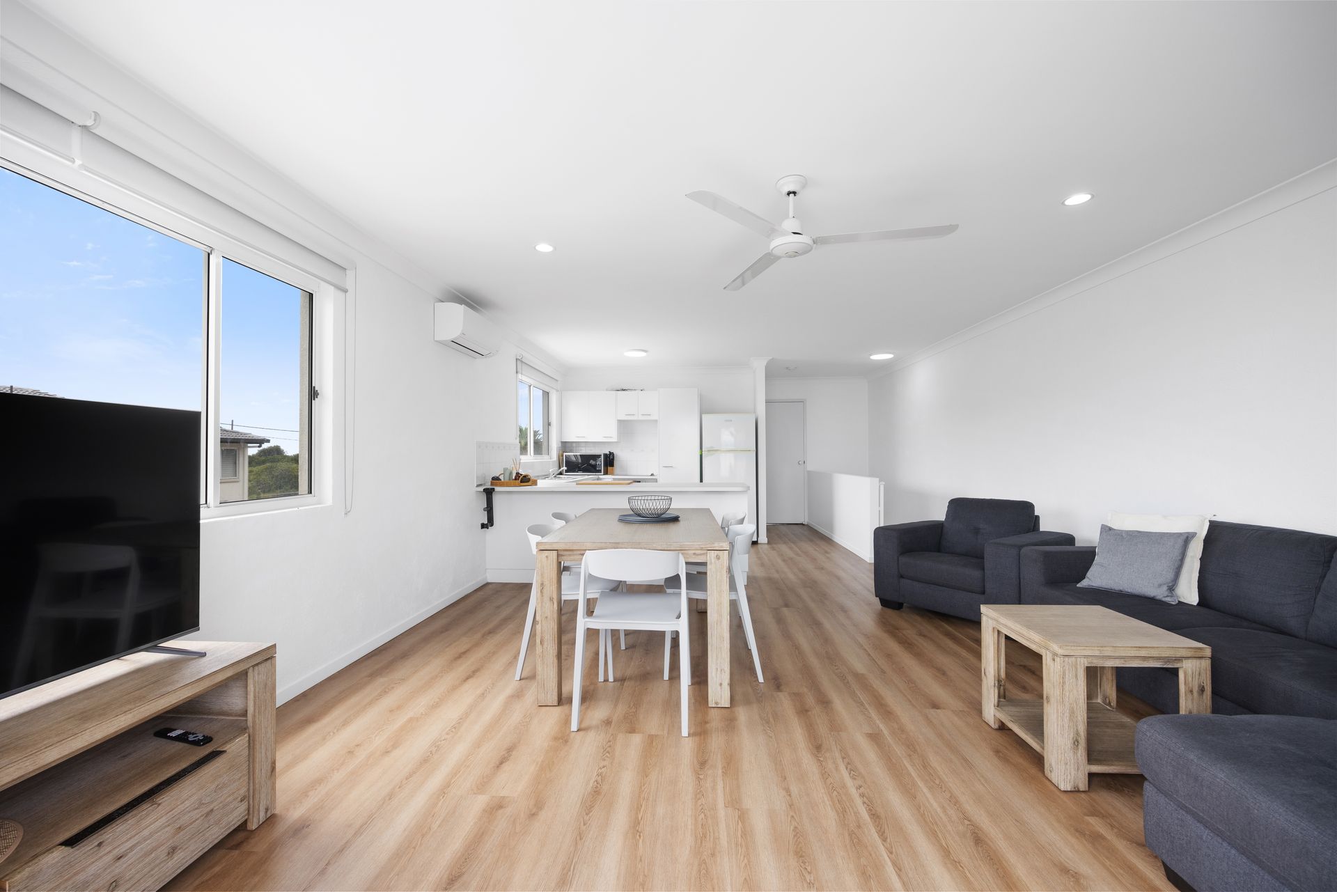 Head upstairs to the open plan living, dining and kitchen with a breezy balcony with pleasant outlooks over the pool, grassed areas and ocean glimpses. The living rooms features a comfortable chaise lounge and a large Smart TV. There is a six seater dining setting to bring the family together at meal time.