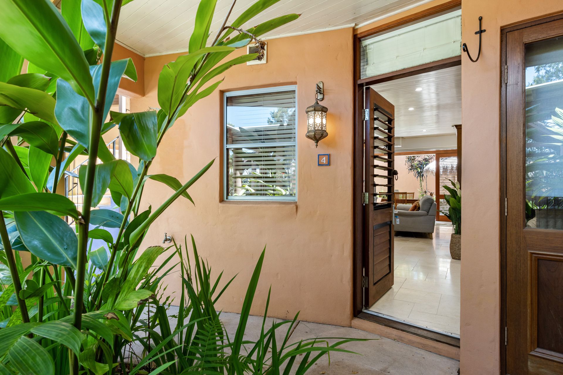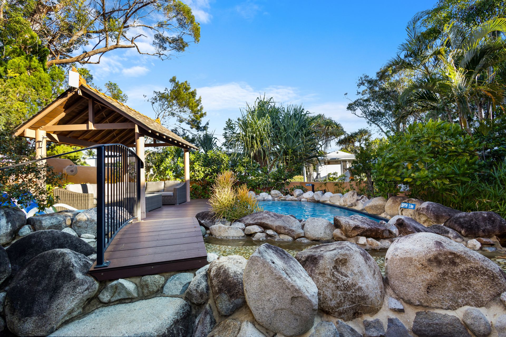 As you enter the sandstone pathway, you'll be captivated by the pool, creating an ambiance reminiscent of French Polynesia. Open the distinctive red cedar door to reveal a world of surprises. The plantation shutters offer maximum privacy, and when opened, unveil a spacious terrace with a garden and a charming Polynesian-style gazebo, providing an ideal spot for alfresco dining. Steps lead to a gate into Natasha Avenue, enhancing convenience.