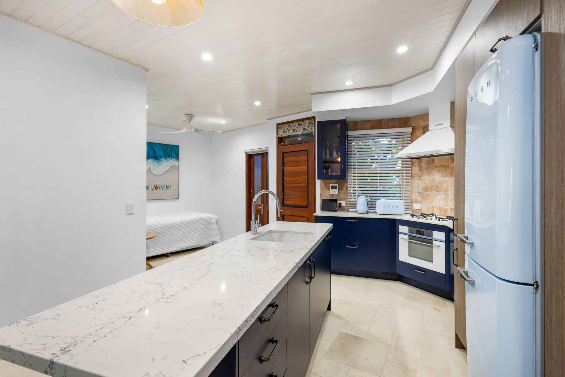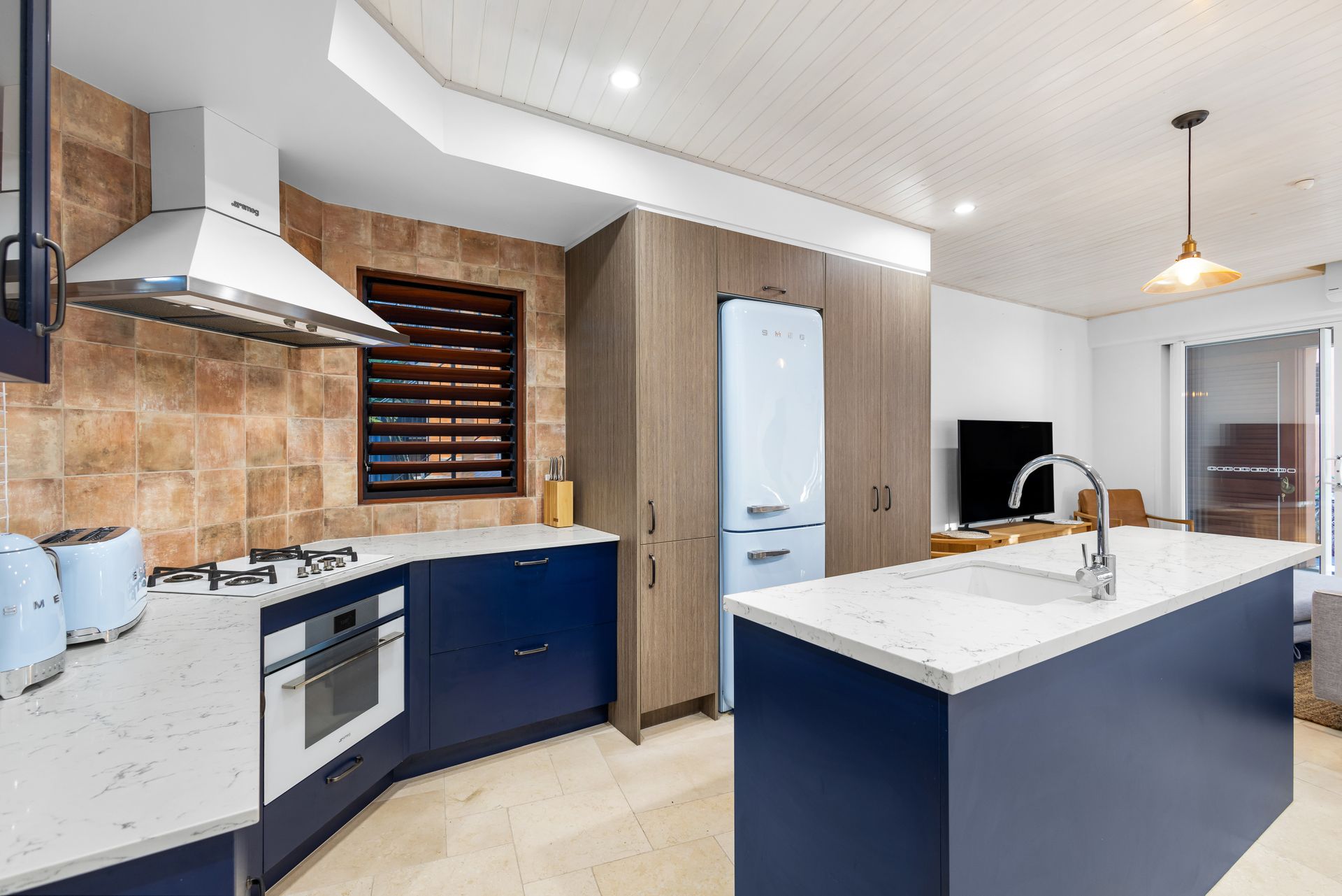 Indulge your inner chef in the designer kitchen with white stone benchtops, a Tuscan ceramic tiled splashback, and high-end appliances, perfect for entertaining guests. The master suite offers a luxurious retreat, featuring garden views, two built-in robes, and a Moroccan-inspired bathroom with a large bathtub and walk-in shower.