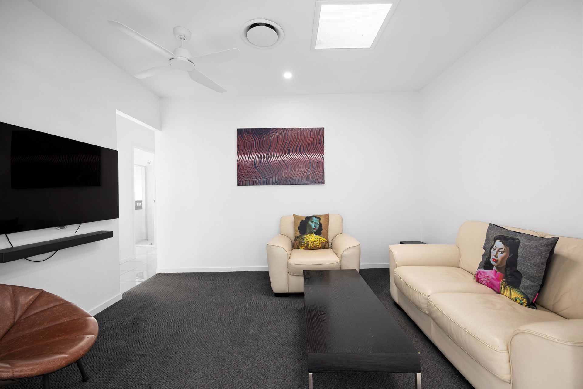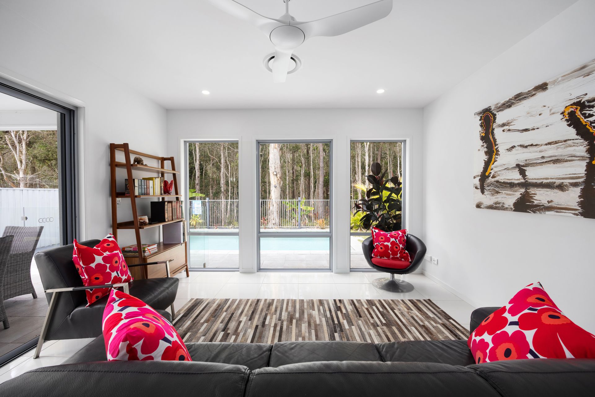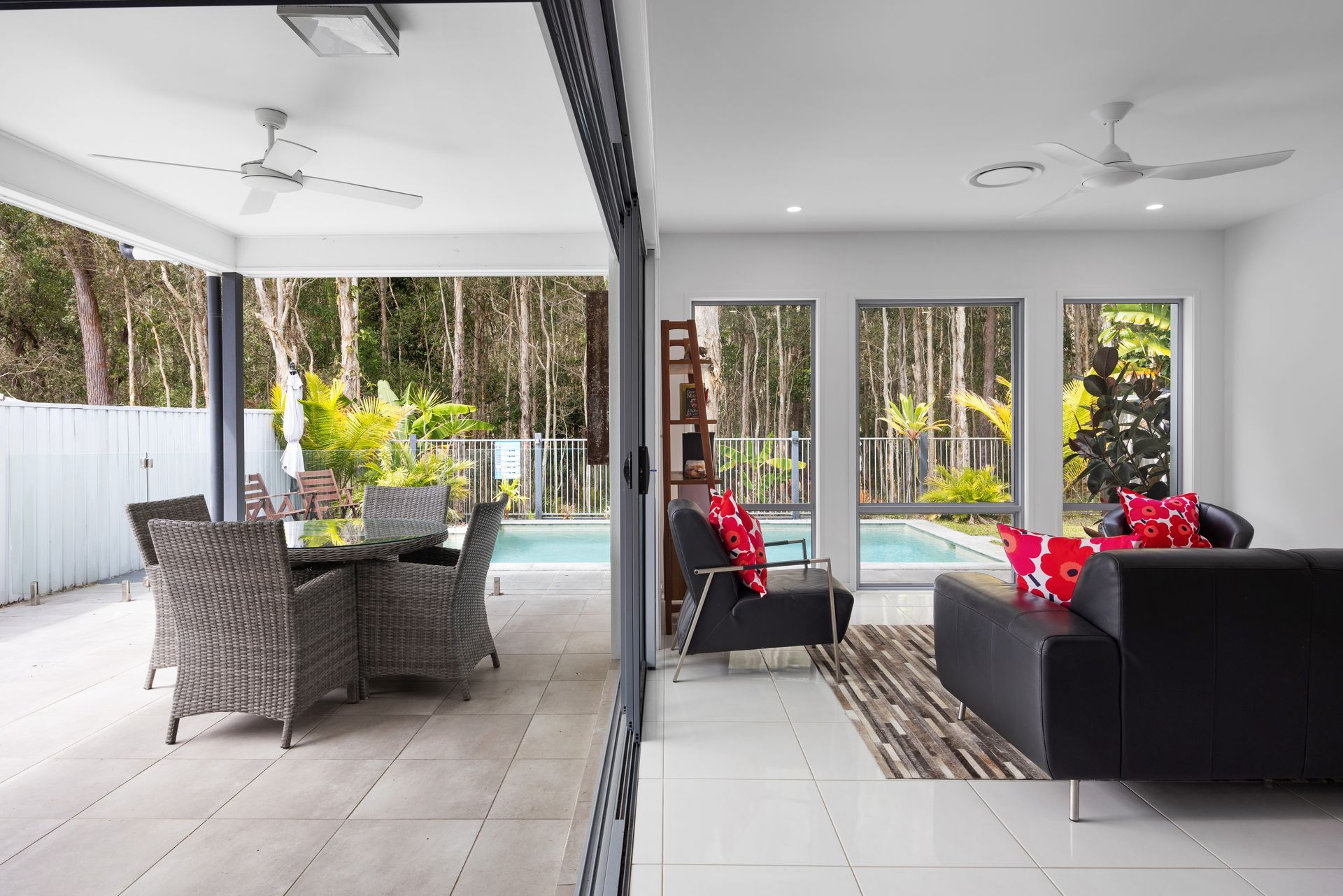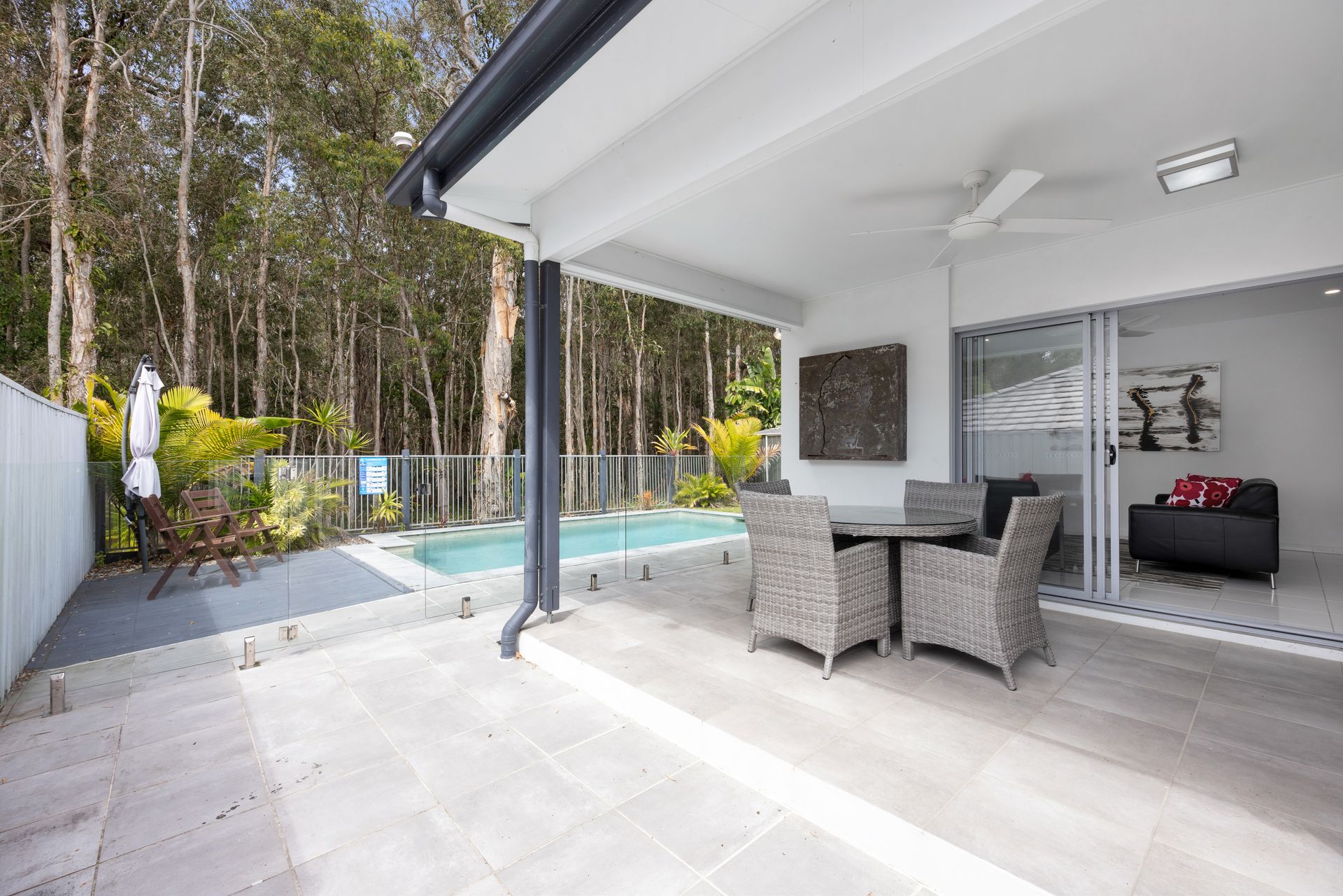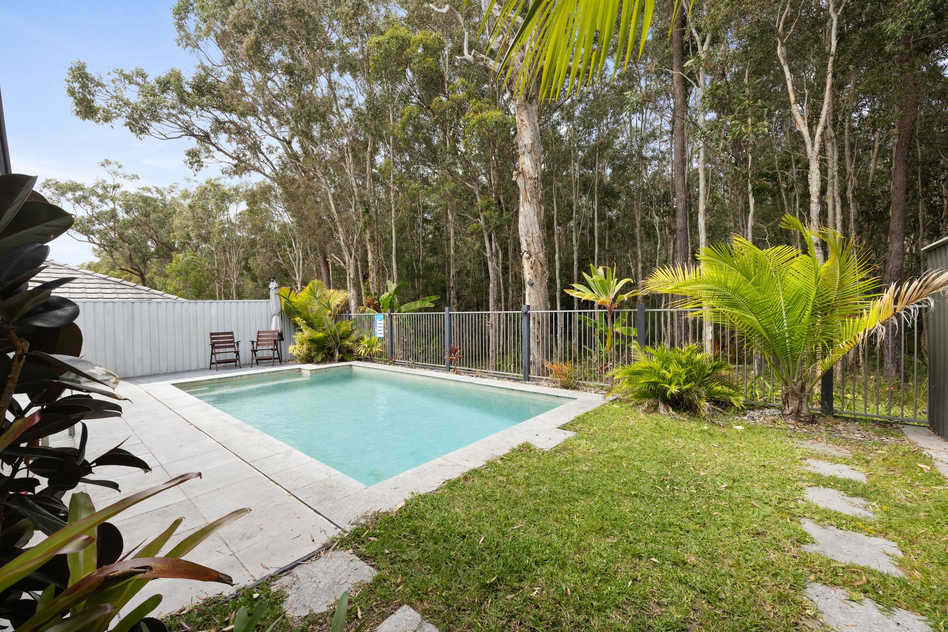 The dining area comfortably accommodates six, making it a great space for family meals or social gatherings. To ensure year-round comfort, the living area is fitted with ducted air conditioning, and ceiling fans are installed in every room. The outdoor patio offers a delightful spot to enjoy alfresco dining, with a dining setting perfect for meals in the fresh air. A large, grassy yard provides a great area for children and pets to play, while the plunge pool is perfect for cooling off on warmer days. For added convenience, there is a double lock-up garage for secure parking.