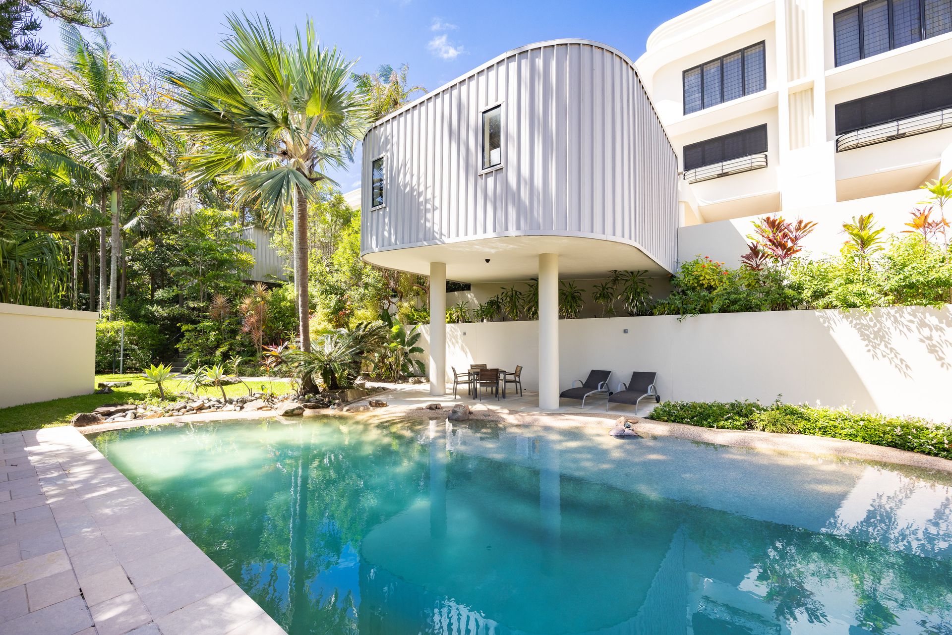 Guests also have access to the complex’s swimming pool, complete with a shallow entry ideal for younger children, plus a sunny grass area surrounded by tropical gardens.