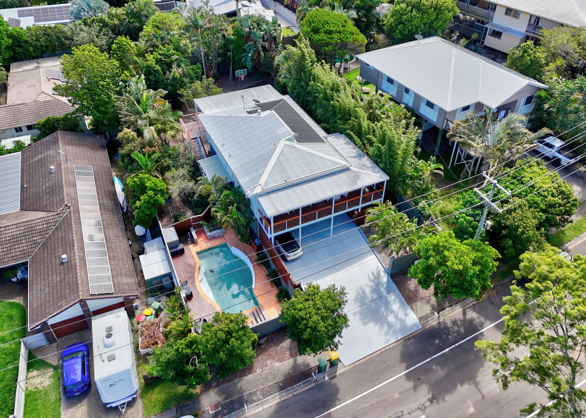 The north-east facing living areas are designed for your comfort, opening out to a covered patio with refreshing breezes – an ideal spot for entertaining. The patio is equipped with a BBQ and overlooks a sparkling pool, creating the perfect setting for relaxed gatherings with family and friends.