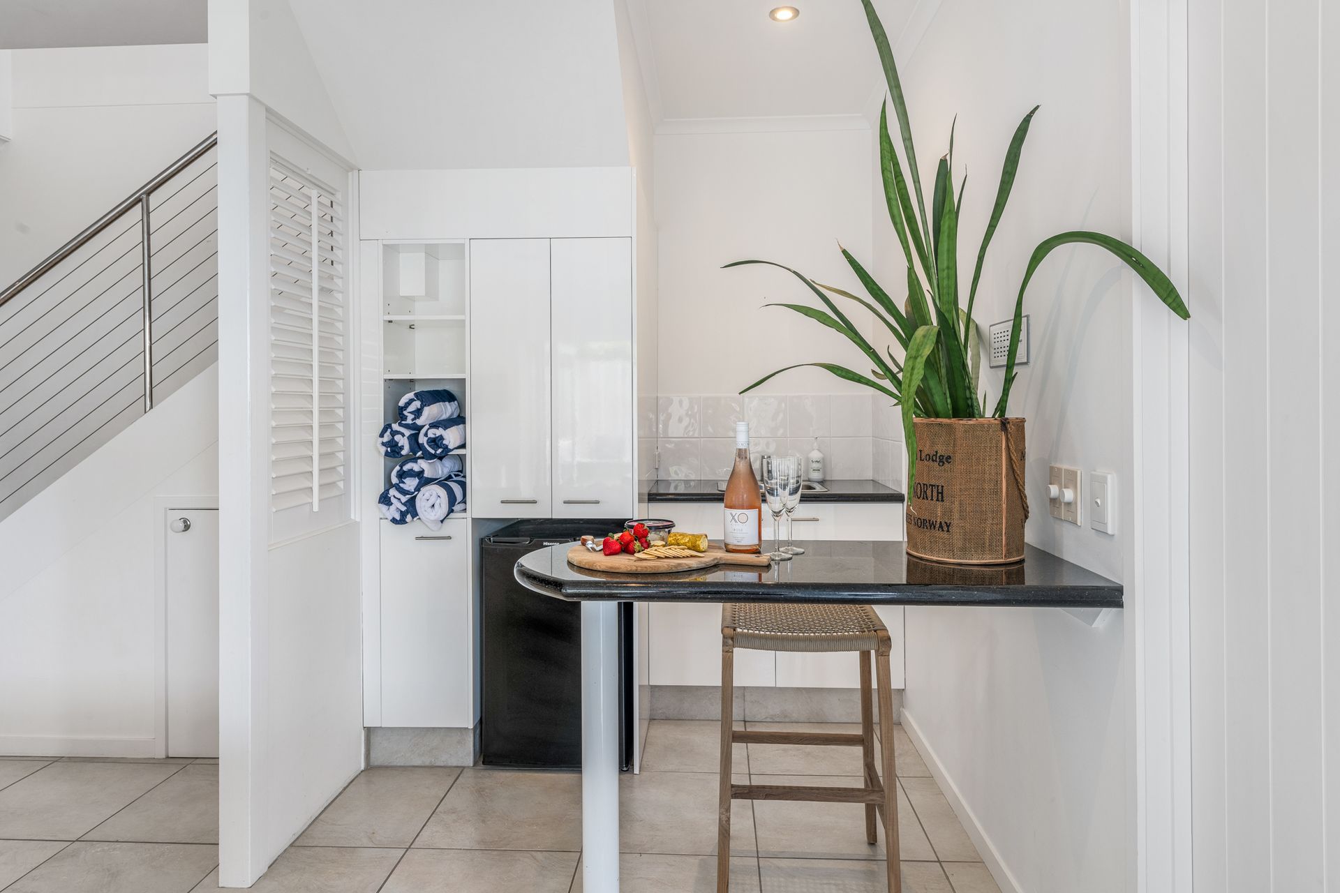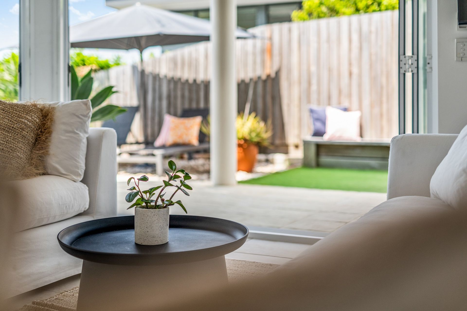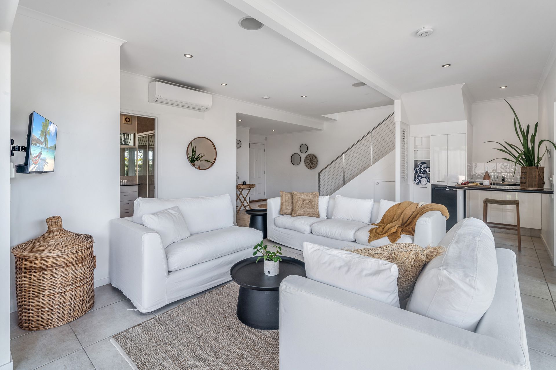 The ground floor offers two generous bedrooms opening to a flat lawn and terrace, complete with outdoor shower and cubby for the kids. Upstairs, the master suite boasts panoramic ocean views, a private ensuite, and access to a terrace made for whale-watching by day and star-gazing by night. A sleek, fully equipped kitchen makes entertaining effortless, whether it’s a casual family meal or a romantic dinner under the moonlight.