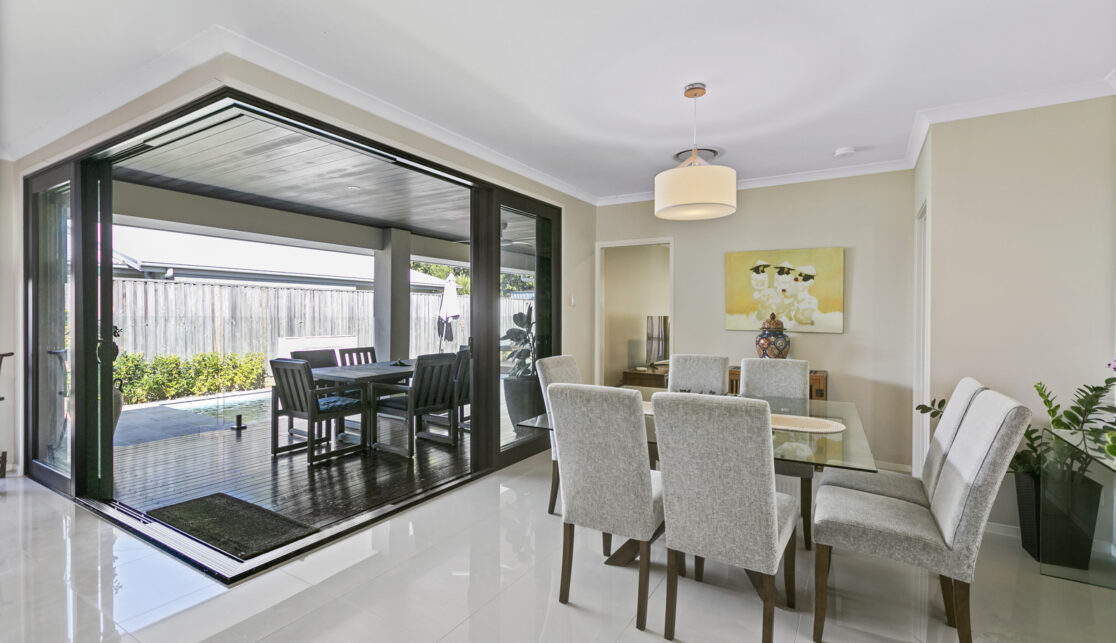 The entire family will enjoy movie nights in the dedicated media room or relax by the covered outdoor terrace beside the sparkling in-ground pool, all flowing seamlessly from the fully tiled living zones.