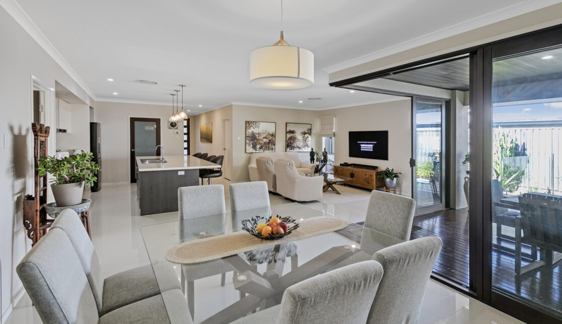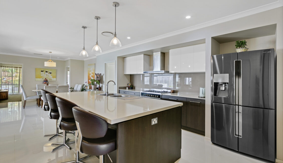 At the heart of the home is the chef’s kitchen, equipped with stone benchtops, stainless steel appliances, soft-close drawers, and a walk-in pantry – perfectly positioned to overlook the open-plan living, dining, and outdoor entertaining areas.