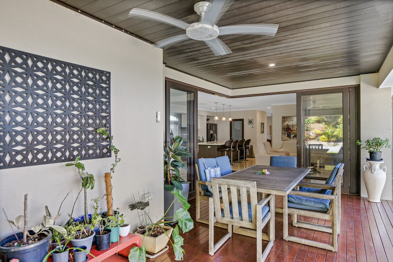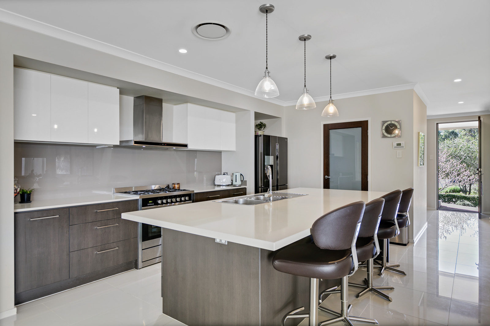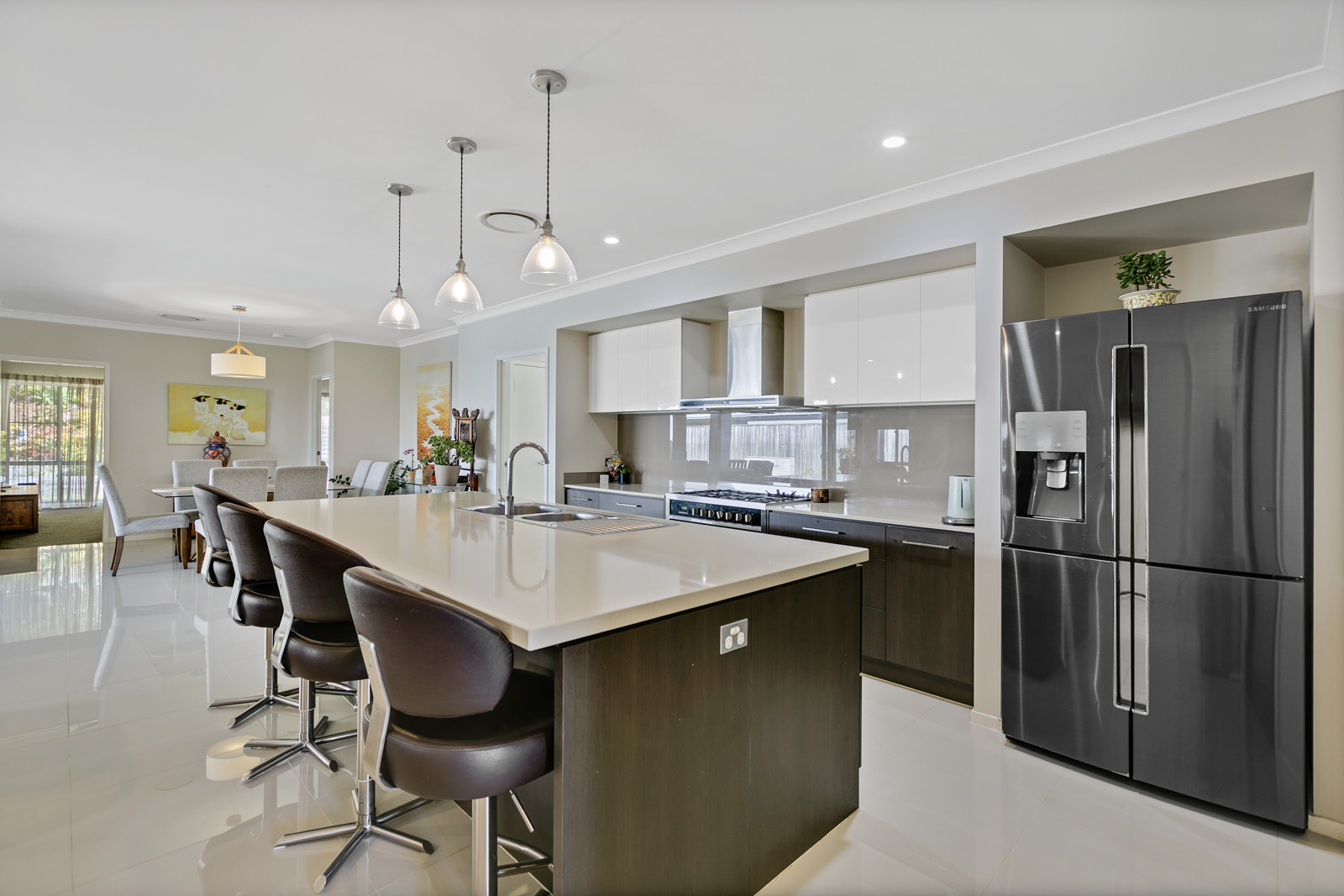 At the heart of the home is the chef’s kitchen, equipped with stone benchtops, stainless steel appliances, soft-close drawers, and a walk-in pantry – perfectly positioned to overlook the open-plan living, dining, and outdoor entertaining areas.